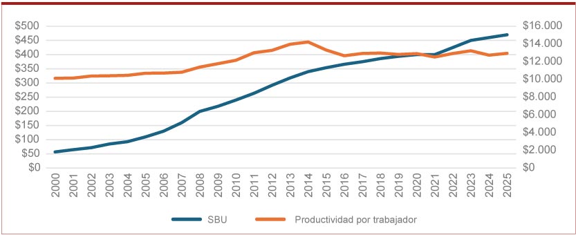 Evolución del SBU frente a la productividad por trabajador (valores constantes de 2010)