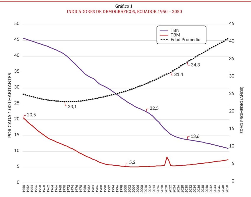 La Tasa Bruta de Natalidad (TBN por cada 1.000 habitantes) ha mostrado una disminución sostenida y se estima que esta tendencia continúe. Para 2030, se proyecta una TBN de 13,6 nacimientos por cada 1.000 habitantes, evidenciando un descenso en comparación con décadas anteriores, cuando en 2010 se registraban 22,5 nacimientos por cada 1.000 habitantes. De manera similar, la Tasa Bruta de Mortalidad (TBM por cada 1.000 habitantes) ha mostrado una tendencia decreciente desde 1950 hasta el año 2000 y estabilidad hasta nuestros días. A pesar del exceso de mortalidad causado por la pandemia de la COVID-19 (8,1 muertes por cada 1.000 habitantes), se proyecta una ligera tendencia ascendente hasta 2050. Como resultado, se observa un incremento en la edad promedio (EP) de la población ecuatoriana. La EP ha aumentado de 23,1 años en 1970 a 31,4 años en 2022, y se proyecta que para 2030 alcance los 34,3 años.