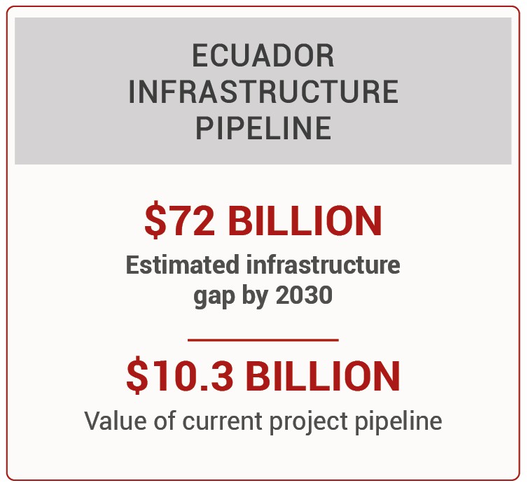 Infrastructure investment remains one of Ecuador’s most pressing development priorities. According to estimates from the Inter-American Development Bank, the country faces an infrastructure gap of approximately $72 billion by 2030. This gap reflects the difference between existing infrastructure and what is needed to sustain long-term economic growth.