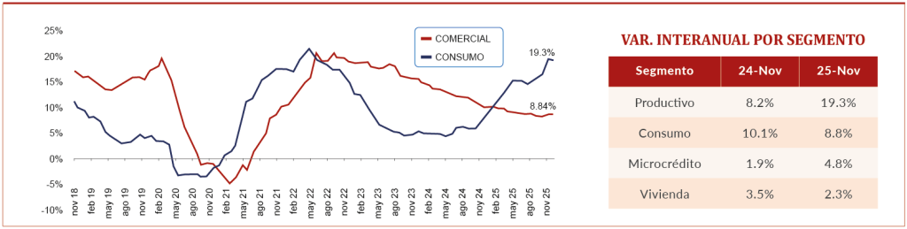 Como se observa en el gráfico, los créditos hacia el segmento comercial o productivo han crecido en un 19,3%, demostrando un crecimiento mucho mayor que el de los créditos de consumo. Por ende, es de esperarse que los empresarios encuentren mayor facilidad de obtener créditos ya sean PYME, y aún mayor facilidad para corporaciones.